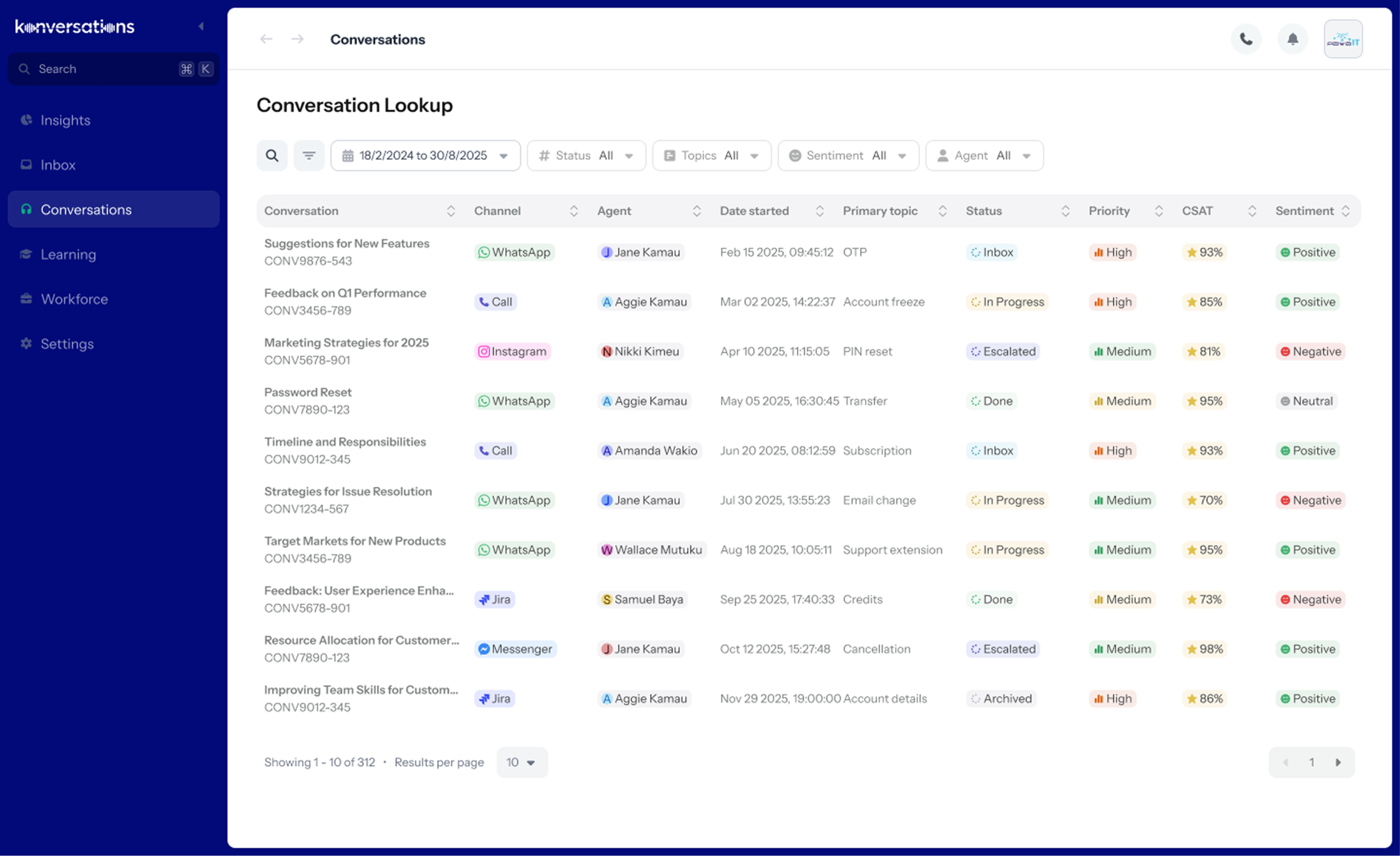 - Full conversation history with sentiment scores and contact details