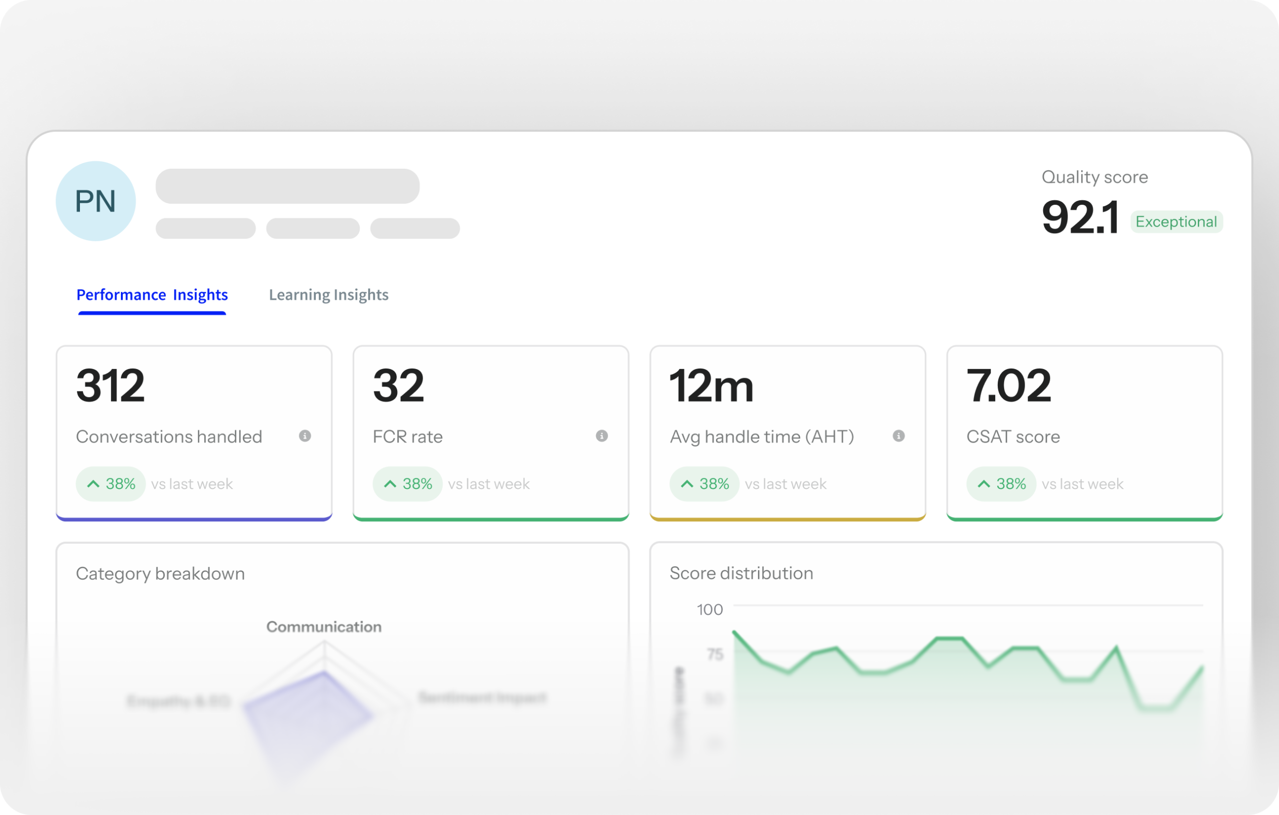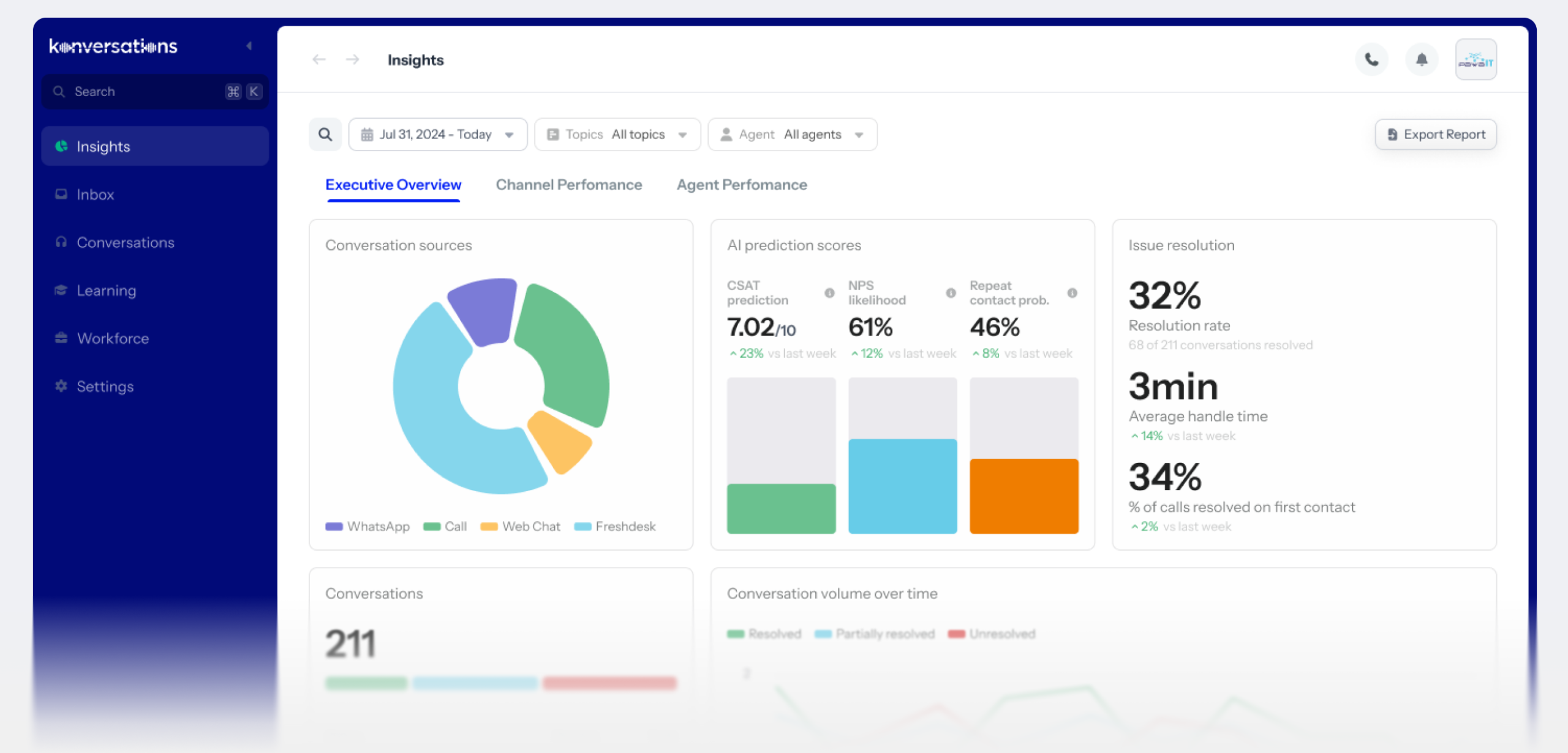 - Real-time view of conversations handled, Quality Scores, and KPIs