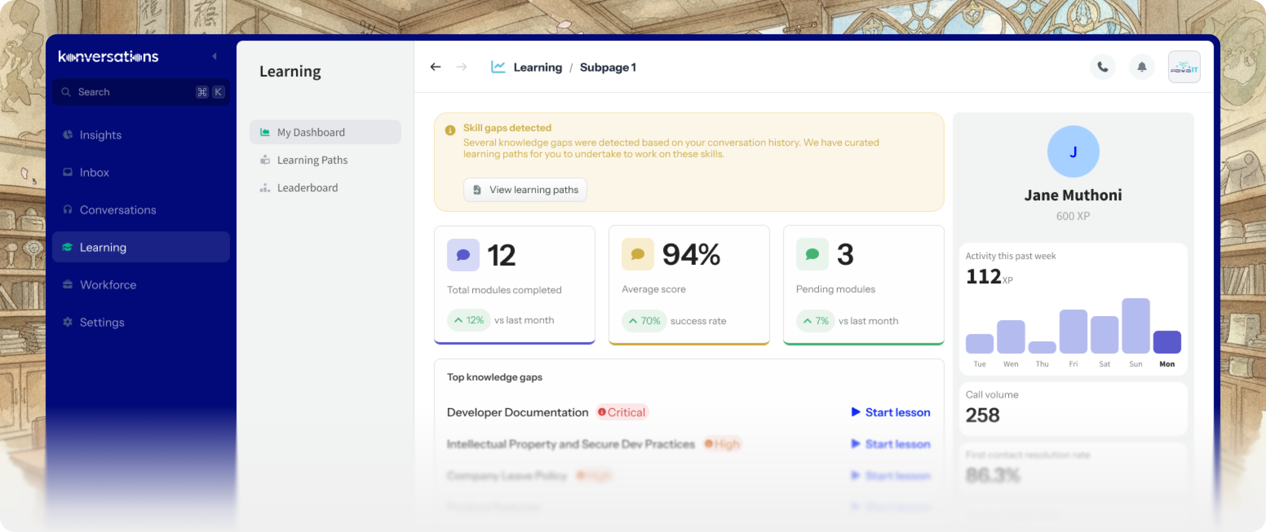 Build a smarter support team with Konversations’ integrated learning platform. Our AI detects knowledge gaps from actual customer interactions and creates personalized learning paths for each agent including customized quizzes. Managers can upload training content, and track performance metrics, turning every conversation into a growth opportunity.